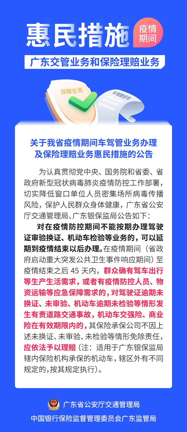 根據(jù)《公告》, 對在疫情防控期間不能按期辦理駕駛證審驗換證、機動車檢驗等業(yè)務(wù)的,可以延期到疫情結(jié)束以后辦理。在疫情期間(省政府啟動重大突發(fā)公共衛(wèi)生事件響應(yīng)期間)至疫情結(jié)束之后45天內(nèi),群眾確有駕車出行等生產(chǎn)生活需求,或者有疫情防控人員、物資運輸?shù)葢?yīng)急保障需求的,對駕駛證逾期未換證、未審驗、機動車逾期未檢驗等情形發(fā)生有責道路交通事故,機動車交強險、商業(yè)險在有效期限內(nèi)的,其保險承保公司不因上述未換證、未審驗、未檢驗等情形免除責任,應(yīng)依法予以理賠。