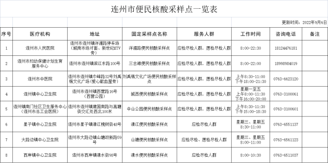 根據(jù)當前實際需要,連州在全市共設置了4大類共60個核酸采樣點,其具體點位、服務時間、服務人群如下: