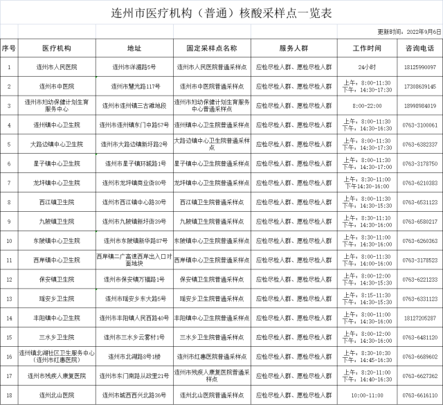 (二)18個醫(yī)療機構(普通)核酸采樣點,其中連州市人民醫(yī)院普通采樣室提供24小時核酸采樣服務;