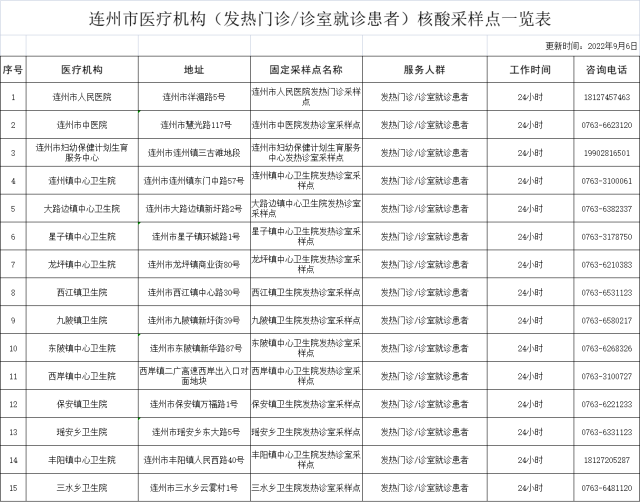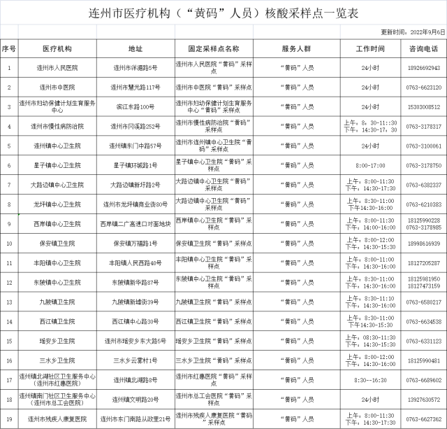 (四)19個黃碼人員核酸采樣點,其中連州市人民醫(yī)院、連州市中醫(yī)院、連州市婦幼保健計劃生育服務中心、連州鎮(zhèn)中心衛(wèi)生院、連州鎮(zhèn)南門社區(qū)衛(wèi)生服務中心(連州市總工會醫(yī)院)為黃碼人員提供24小時核酸采樣服務。