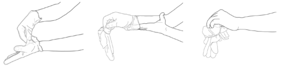 ①用戴著手套的手捏住另一只手套污染面的邊緣將手套脫下;