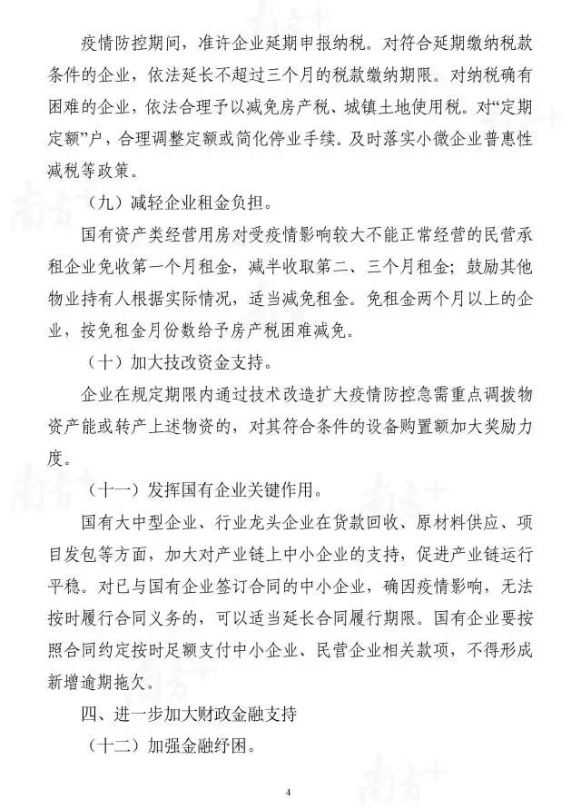針對(duì)企業(yè)普遍反映的租金、稅費(fèi)和違約風(fēng)險(xiǎn)等問題,《政策措施》提出,疫情防控期間準(zhǔn)許企業(yè)延期申報(bào)納稅。對(duì)符合延期繳納稅款條件的企業(yè),依法延長(zhǎng)不超過三個(gè)月的稅款繳納期限。對(duì)納稅確有困難的企業(yè),依法合理予以減免房產(chǎn)稅、城鎮(zhèn)土地使用稅。