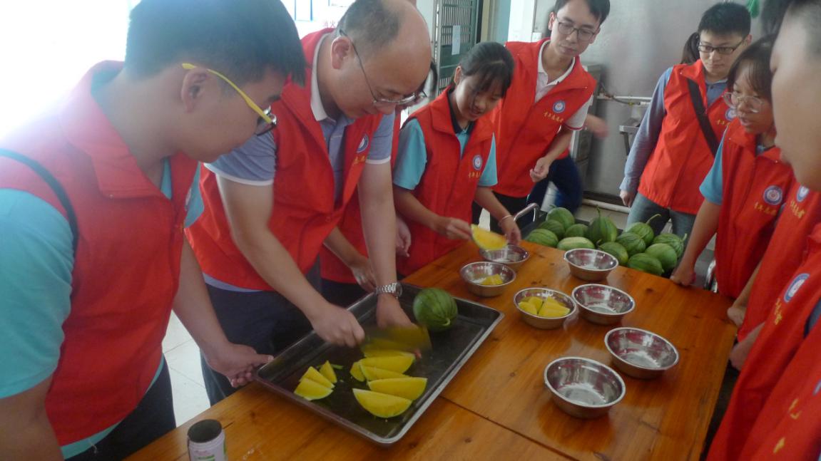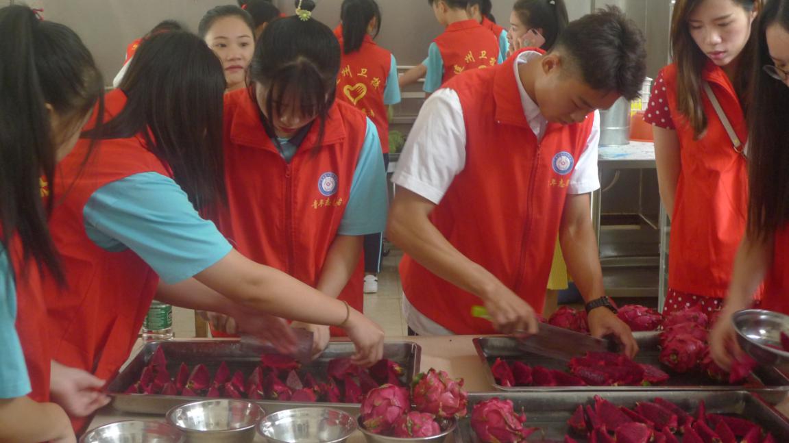 亮晶晶的葡萄,香甜的香蕉,紅彤彤的火龍果……大家爭先恐后地進行清洗,切塊,裝盤,忙得不亦樂乎。大家看著這些新鮮的水果,仿佛看到了老人們開心的笑臉,頓時心里暖暖的。