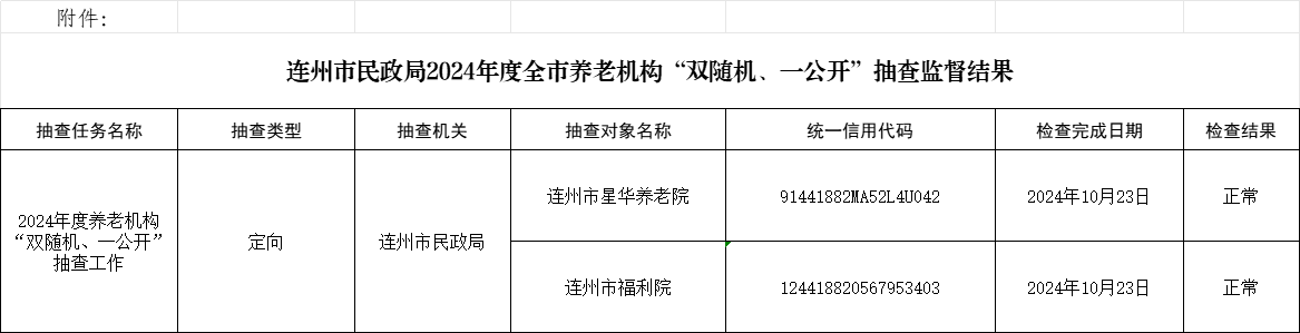 附件:連州市民政局2024年度全市養(yǎng)老機構(gòu)“雙隨機、一公開”抽查監(jiān)督結(jié)果