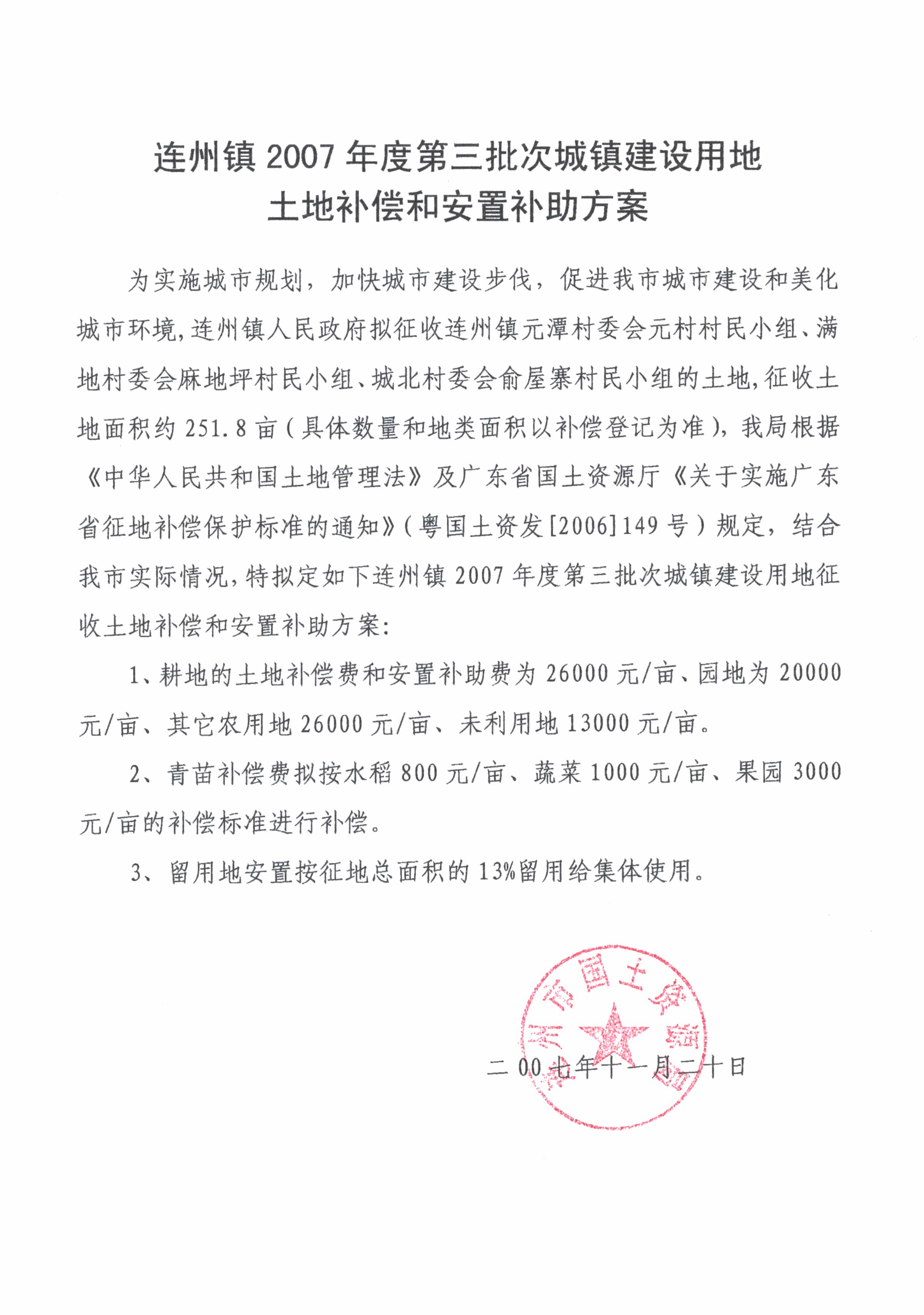 關(guān)于連州市連州鎮(zhèn)2007第三批次城鎮(zhèn)建設(shè)用地的征地補償安置方案公告