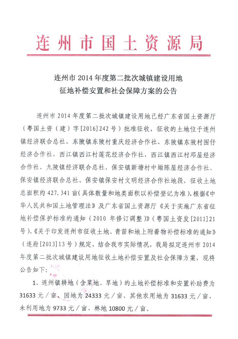 連州市2014年第二批次城鎮(zhèn)建設(shè)用地征地補償安置方案公告