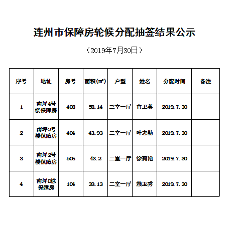 連州市保障房2019年7月輪候分配抽簽結(jié)果公示
