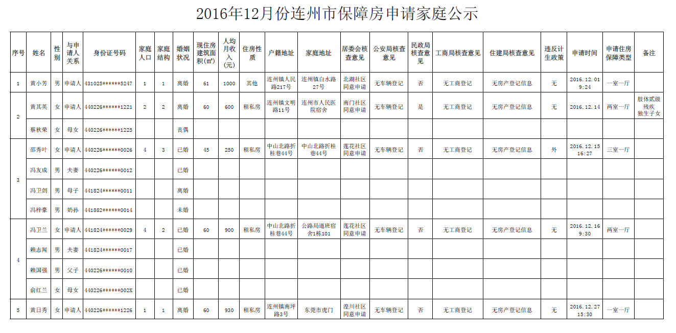 2016年12月份連州市保障房申請家庭,現(xiàn)予以公示,公示期為20天,公示期內(nèi),如對保障房申請家庭有異議的,請向連州市住保辦反映。