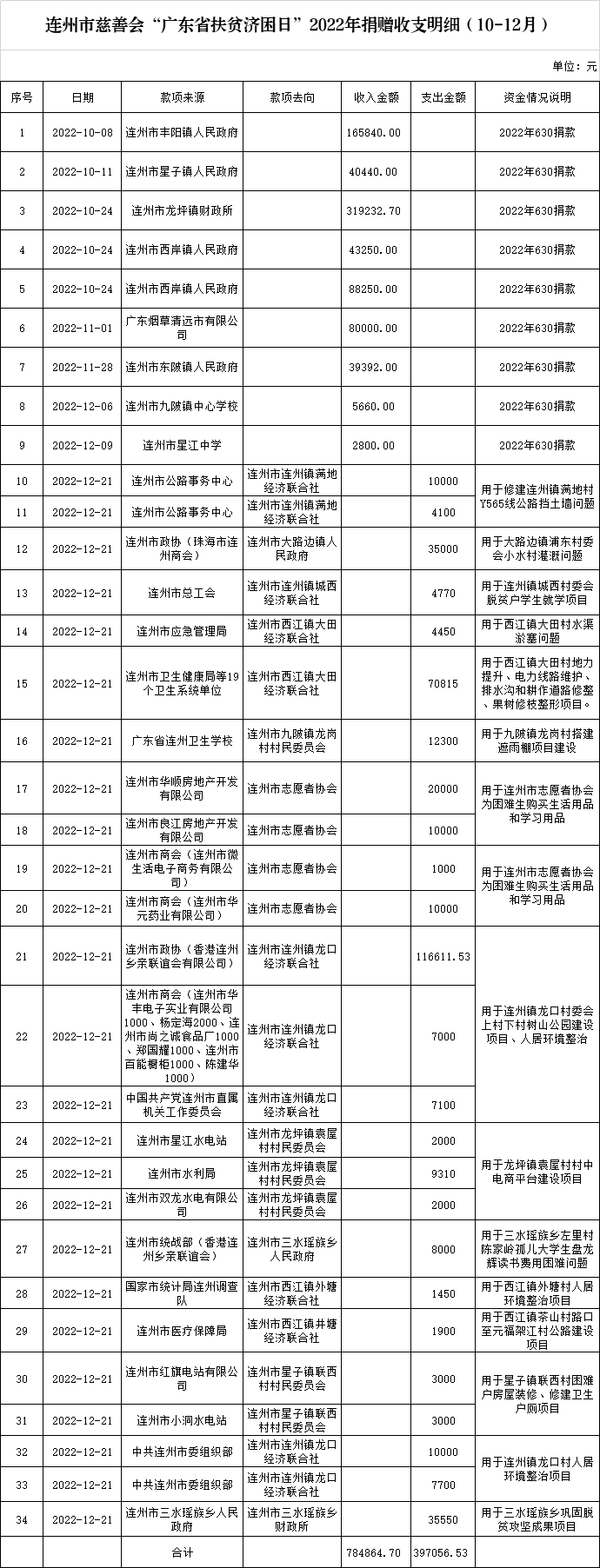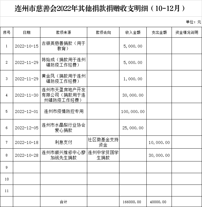 關(guān)于連州市慈善會(huì)2022年第四季度捐贈(zèng)收支明細(xì)的公示