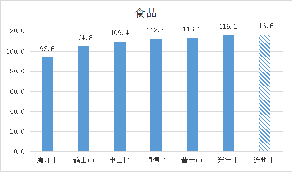 在全省7個(gè)開展CPI調(diào)查的縣區(qū)中,按食品類價(jià)格同比漲幅由高到低排序,連州位列第一位(如圖3所示)。