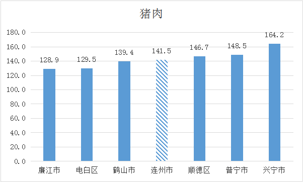 在全省7個(gè)開展CPI調(diào)查的縣區(qū)中,按豬肉價(jià)格同比漲幅由高到低排序,連州位列第四位(如圖5所示)。