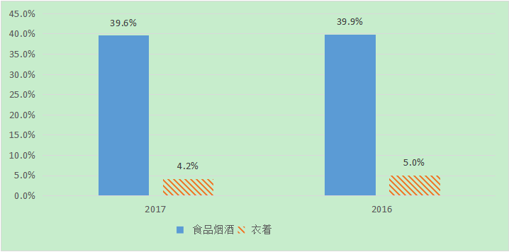 圖1:2016-2017年連州農(nóng)村居民食品煙酒和衣著消費支出占比