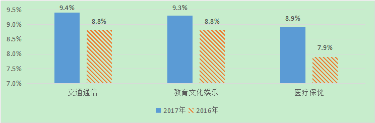 圖2:2016-2017年醫(yī)療保健、教育文化娛樂和交通通信消費占比情況