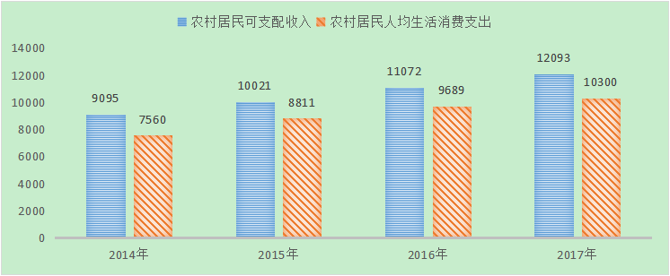 2017年,連州農(nóng)村居民人均生活消費支出10300元,比上年增加611元,同比增長6.3%。