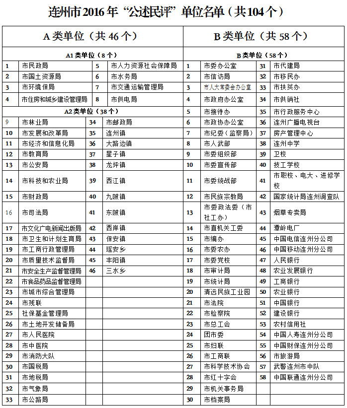 將市直正科以上單位、鎮(zhèn)(鄉(xiāng))以及與社會(huì)公眾聯(lián)系密切的省、清駐連單位共104個(gè)單位(名單見附件1)列入“公述民評(píng)”活動(dòng)范圍。按照突出重點(diǎn)、重心下移的工作思路,將市民政局、市國土局、市環(huán)保局、市住建局、市水務(wù)局、市供電局、市人社局、市交通局等8個(gè)單位列為重點(diǎn)評(píng)議單位(A1類),繼續(xù)開展抽檢評(píng)議,并對(duì)重點(diǎn)評(píng)議單位具有行政執(zhí)法或監(jiān)督職能的部分業(yè)務(wù)科室人員進(jìn)行評(píng)議,著力解決不作為、慢作為和亂作為的問題。