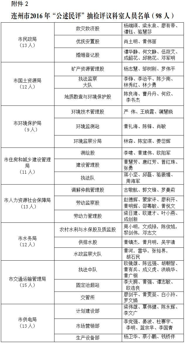 2.連州市2016年“公述民評(píng)”抽檢評(píng)議科室人員名單