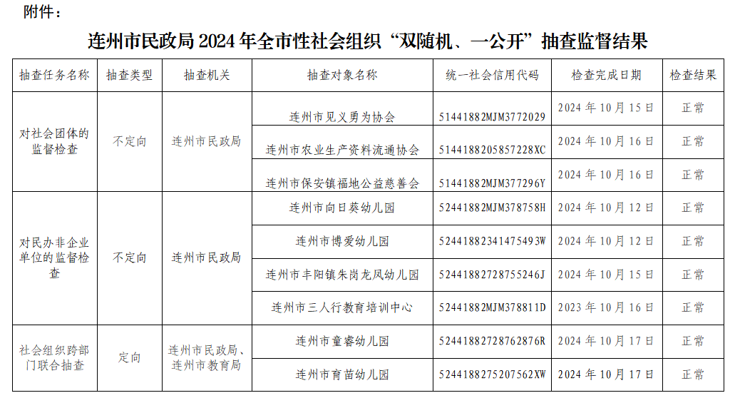 連州市民政局關(guān)于2024年全市性社會組織“雙隨機、一公開”抽查監(jiān)督結(jié)果公布