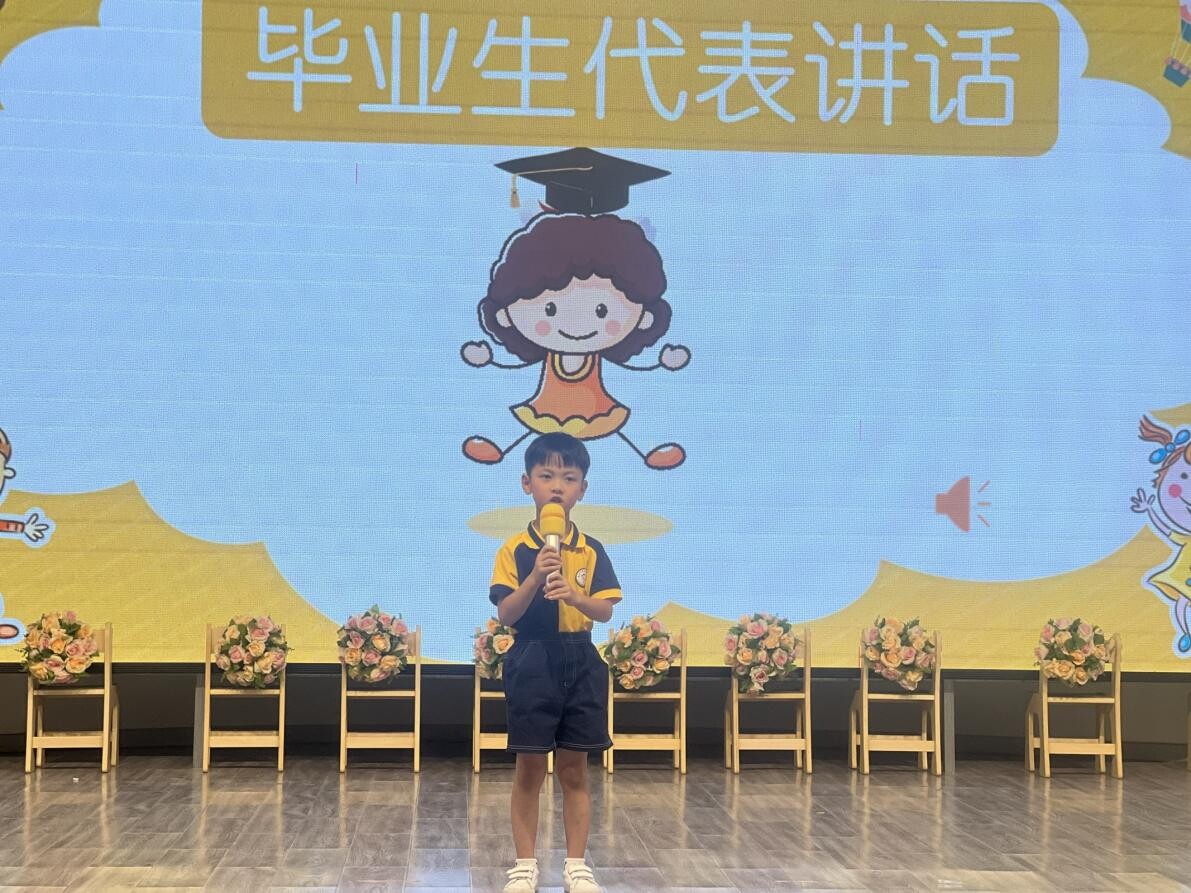 畢業(yè)生代表講話——幼兒代表朱嘉軒、于奕揚(yáng)用童言稚語(yǔ)真誠(chéng)地表達(dá)了對(duì)幼兒園的依依惜別之情和對(duì)老師的愛(ài),感謝老師的辛勤教導(dǎo)、愛(ài)心哺育。