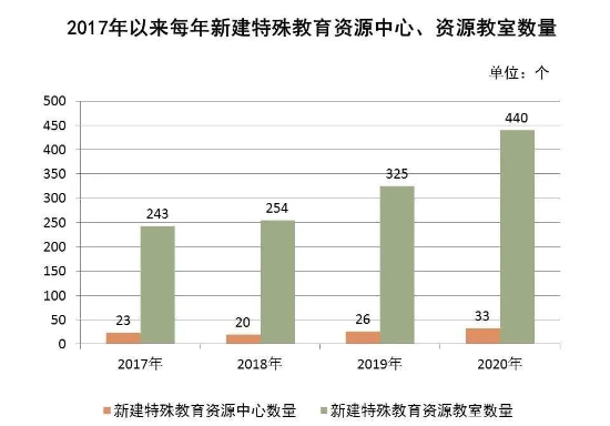 三是完善殘疾學生隨班就讀服務(wù)體系。要求各地依托地級以上市和縣(市、區(qū))特殊教育學校,設(shè)立隨班就讀工作指導中心,落實特殊教育學校定期委派教師到普通學校巡回指導隨班就讀工作制度。目前,大部分市、縣(市、區(qū))已建立了隨班就讀工作指導中心,普通學校特殊教育資源教室建設(shè)穩(wěn)步推進。2017年以來,全省新建隨班就讀資源教室440個,資源中心33個。2017年以來每年新建特殊教育資源中心、資源教室數(shù)量見下表: