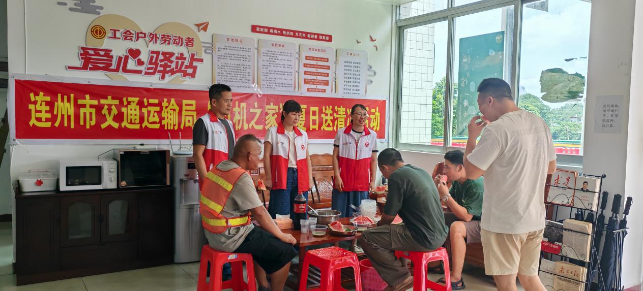 717日上午,連州市交通運(yùn)輸局工會(huì)在洲水、西江治超點(diǎn)戶外勞動(dòng)者愛心驛站“司機(jī)之家”開展了“夏日送清涼”活動(dòng)。在38度的高溫天氣為過往司乘人員及一線治超工作人員送上了綠豆沙、西瓜解暑,叮囑大家酷暑天氣強(qiáng)化防護(hù)意識(shí),做好防暑降溫措施,堅(jiān)守工作崗位的同時(shí)確保自身安全健康。通過工會(huì)“夏日送清涼”活動(dòng),把清涼送到勞動(dòng)者身邊,更把溫暖留在心間,讓道路運(yùn)輸從業(yè)者擁有更多獲得感、幸福感、安全感。