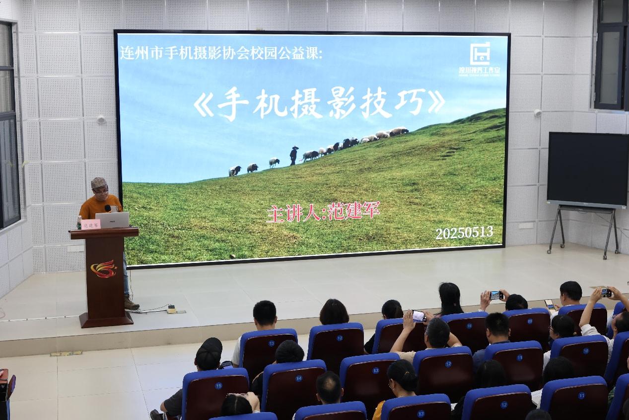 揭牌儀式后,湟川視界工作室負(fù)責(zé)人范建軍帶來首場特色課程講座——《手機攝影技巧》。通過案例演示與互動問答,現(xiàn)場師生掌握了構(gòu)圖、光影等實用技能,反響熱烈。