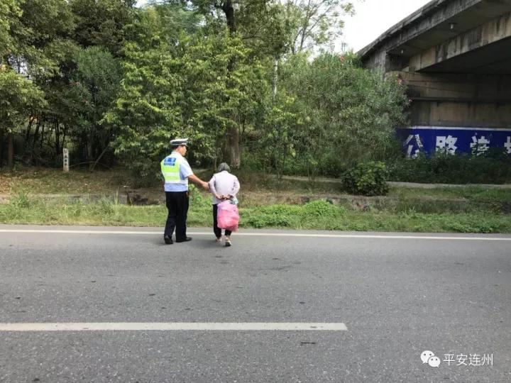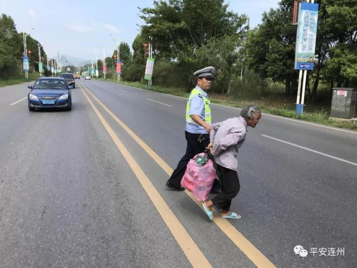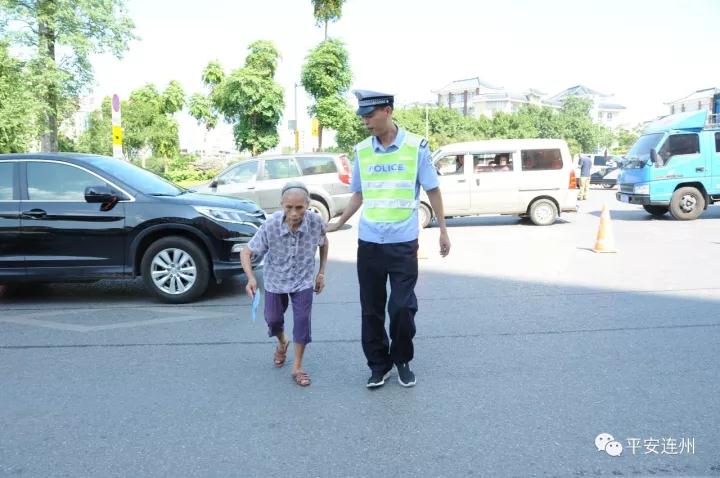 4老人家蹣跚步行過馬路,險象環(huán)生,執(zhí)勤交警熱情相助,小心翼翼地扶老人家安全過馬路。