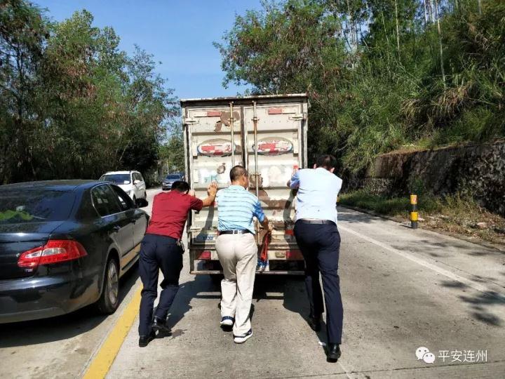 6四方井路段,小貨車與前方的車輛發(fā)生追尾事故,在路中間拋錨。途徑此處的交警為了疏導(dǎo)交通,幫助司機把車推至路邊,等候處理。