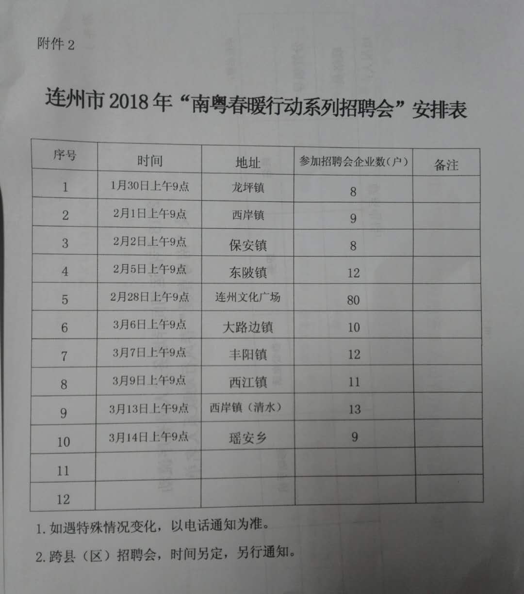 根據2018年連州市南粵春暖活動方案,連州市人社局將于2018年2月28日、3月6日、3月7日、3月9日、3月13日和3月14日分別在連州文化廣場、大路邊鎮(zhèn)、豐陽鎮(zhèn)、西江鎮(zhèn)、西岸鎮(zhèn)和瑤安鄉(xiāng)舉辦大型戶外招聘會。屆時,連州市人社局和市殘聯將組織招聘殘疾人崗位的企業(yè)下基層進行殘疾人招聘,現場將設有殘疾人招聘專區(qū),為當地殘疾人提供就業(yè)及政策咨詢服務,在2月28日的文化廣場專場中,清遠市殘聯將會同30間企業(yè)設置36個殘疾人崗位進行就業(yè)招聘。