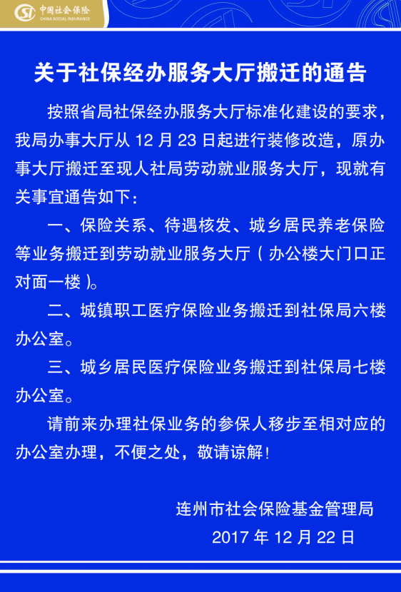 關(guān)于社保經(jīng)辦服務(wù)大廳搬遷的通知