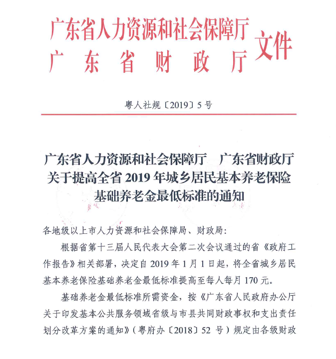 關(guān)于提高全省2019年城鄉(xiāng)居民基本養(yǎng)老保險基礎養(yǎng)老金最低標準的通知(粵人社規(guī)[2019]5號)