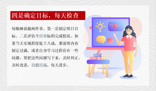 班主任還介紹了如何在疫情期科學(xué)做好停課不停學(xué)。一是學(xué)習(xí)要專注;二是緩急相濟(jì),合理利用;三是及時(shí)獎(jiǎng)賞,有收獲感;四是確定目標(biāo),每天檢查,在完成學(xué)校老師線上布置的功課外,對(duì)各學(xué)科的知識(shí)進(jìn)行查漏補(bǔ)缺,建立知識(shí)系統(tǒng),為即將到來(lái)的新學(xué)期做好充分準(zhǔn)備。