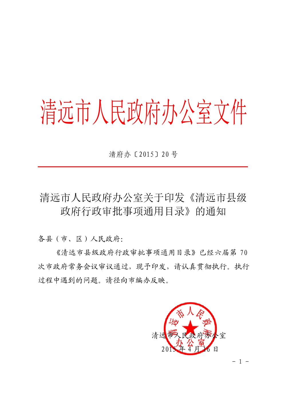 清遠市人民政府辦公室關(guān)于印發(fā)《清遠市縣級政府行政審批事項通用目錄》的通知(清府辦[2015]20號)