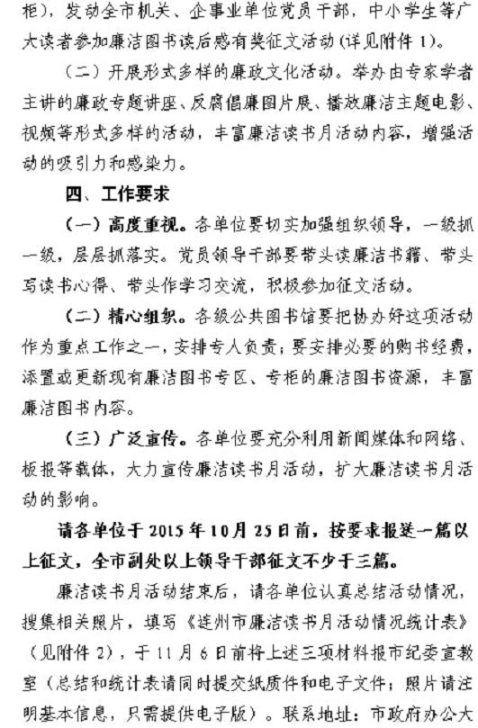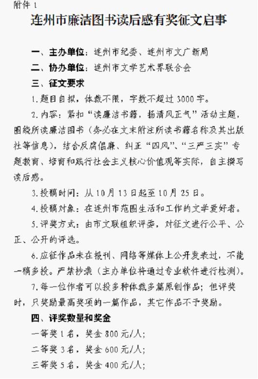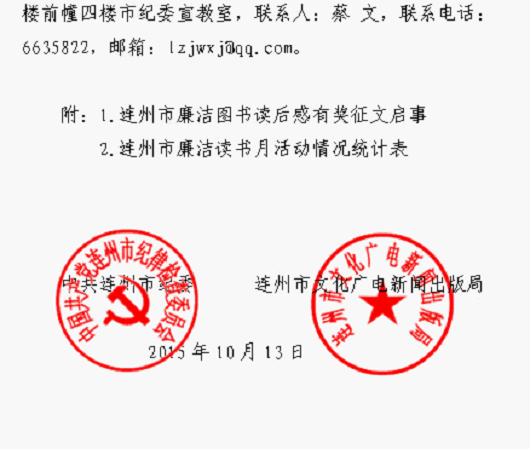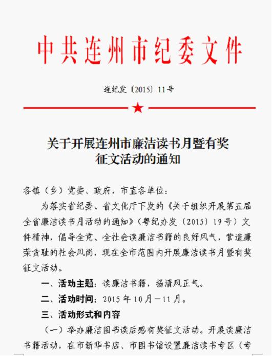 關(guān)于開展連州市廉潔讀書月暨有獎?wù)魑幕顒拥耐ㄖ?/h3>