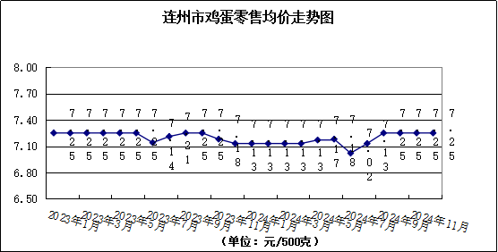 蛋類(lèi)雞蛋平均零售價(jià)格為7.25元/500克,環(huán)比不變。鴨蛋平均零售價(jià)格為8.63元/500克,環(huán)比不變。