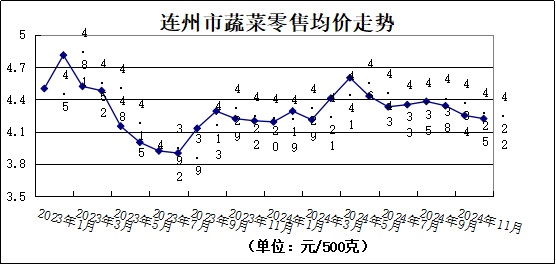 12月份,我市蔬菜價(jià)格持續(xù)下降,降幅收窄。農(nóng)貿(mào)市場(chǎng)監(jiān)測(cè)的30種主要蔬菜零售價(jià)格“10升6平14降”,蔬菜類(lèi)平均零售價(jià)格為4.22元/500克,環(huán)比降0.71%。其中,葉菜類(lèi)零售價(jià)格為4.17元/500克,環(huán)比降0.48%,花菜類(lèi)零售價(jià)格為3.75元/500克,環(huán)比降2.09%,瓜菜類(lèi)零售價(jià)格為4.29元/500克,環(huán)比降0.46%,根莖類(lèi)零售價(jià)格為4.37元/500克,環(huán)比降1.35%。