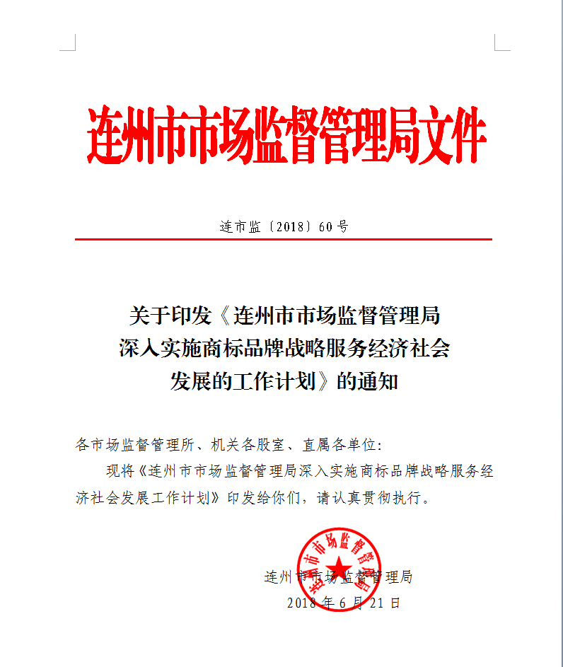 關(guān)于印發(fā)《連州市市場監(jiān)督管理局深入實施商標品牌戰(zhàn)略服務(wù)經(jīng)濟社會發(fā)展的工作計劃》的通知