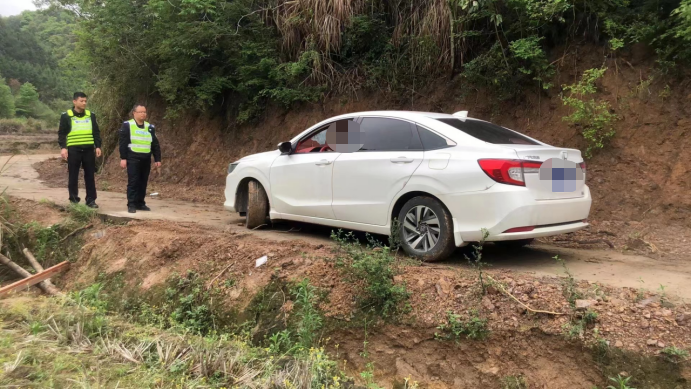 2023年4月2日16時(shí)許,連州市公安局保安派出所民輔警在轄區(qū)開(kāi)展治安巡查過(guò)程中,巡至石仔坳村路段時(shí),發(fā)現(xiàn)一輛小車陷進(jìn)了路邊的泥土中無(wú)法動(dòng)彈,稍有不慎極有可能會(huì)滑進(jìn)田里。